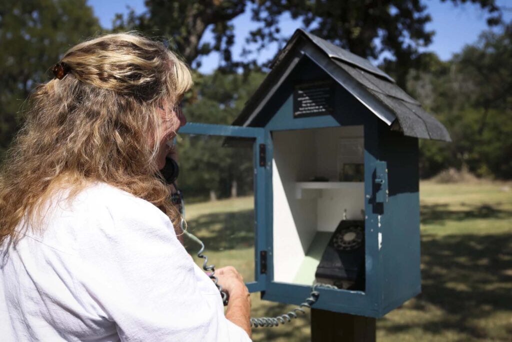 Julie Compton looks at the wind phone – a way to share memories and say goodbye to loved ones – Tuesday, Aug. 19, 2025, at Bowman Springs Park in Arlington.