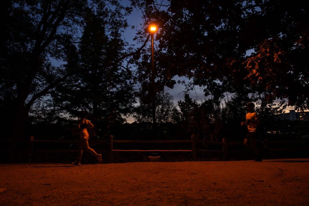 Joggers run along the Ann and Roy Butler Hike and Bike Trail near Rainey Street after sunset.