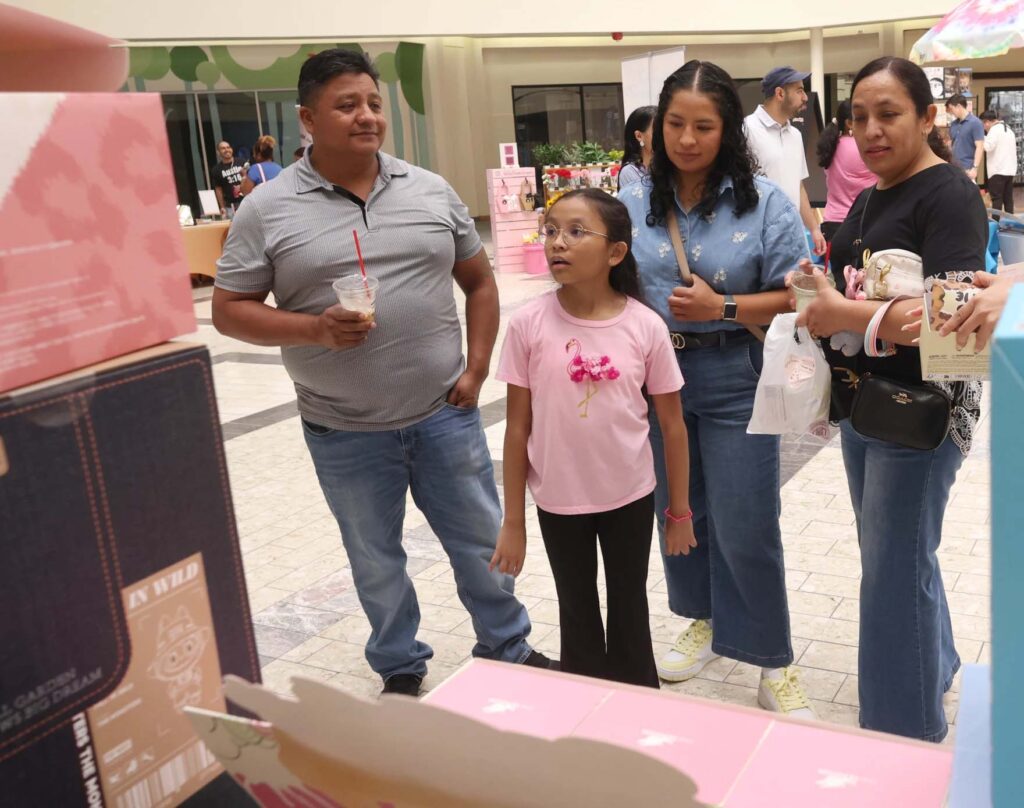 Pictured from left, Pablo Medrano, Diana Medrano, 9, Daniela Ramirez and Rosa Medrano as they checked out a display of labubu products for display and sale at a Labubu festival which was held at The Shops at RedBird in Dallas, on September 7, 2025.