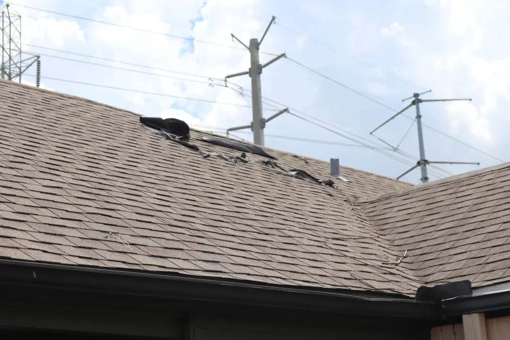 Pictured is storm-related roof damage at the Vintage at 18th apartment complex in Houston.