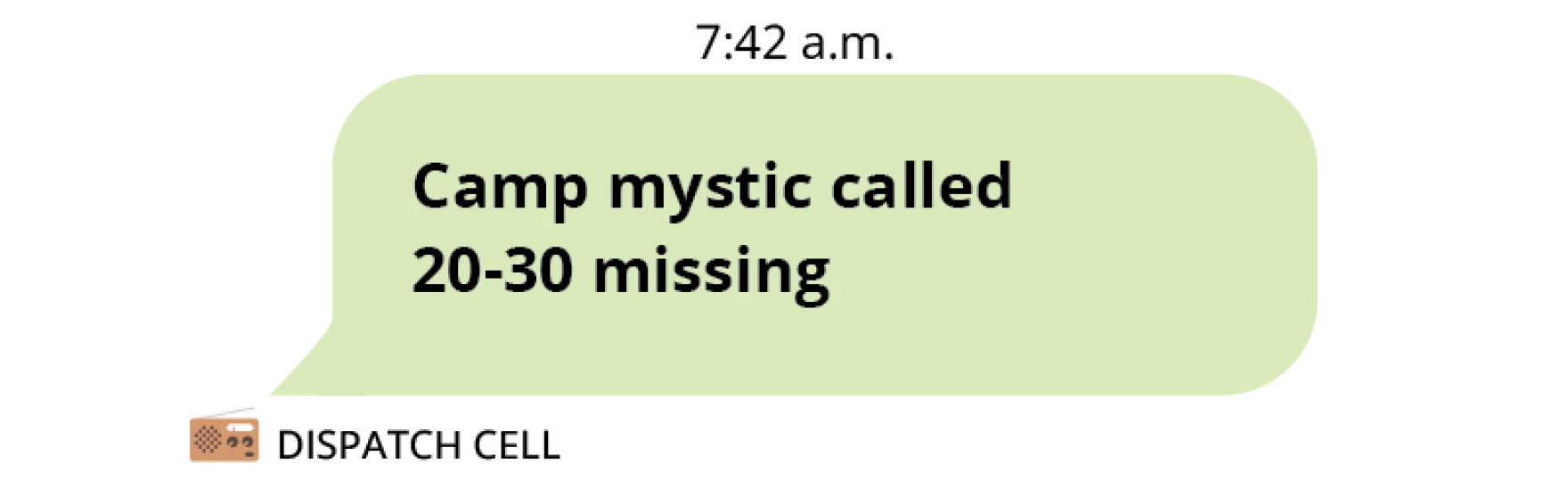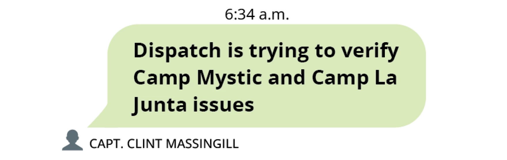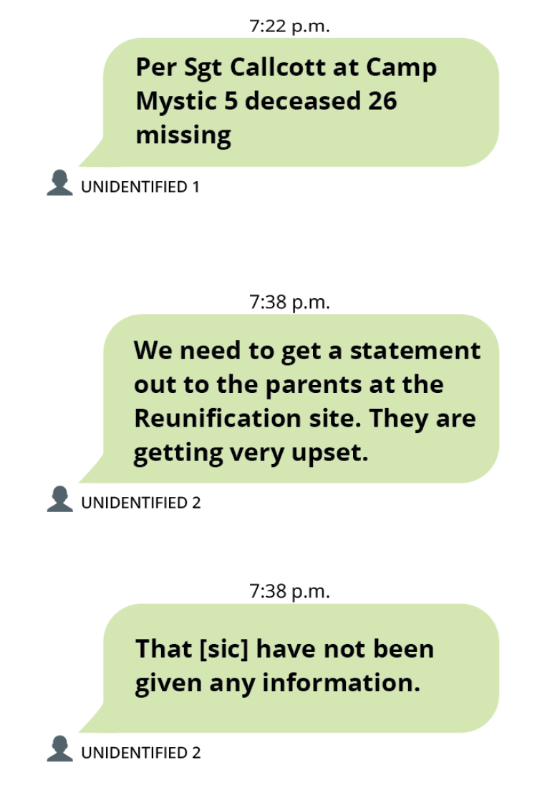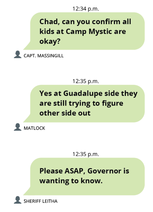 But it wasn’t until 6:34 a.m. — more than two hours later — that a Kerr County sheriff’s office captain sent the first text message to a group of emergency response leaders about what he called potential “issues” at Camp Mystic.