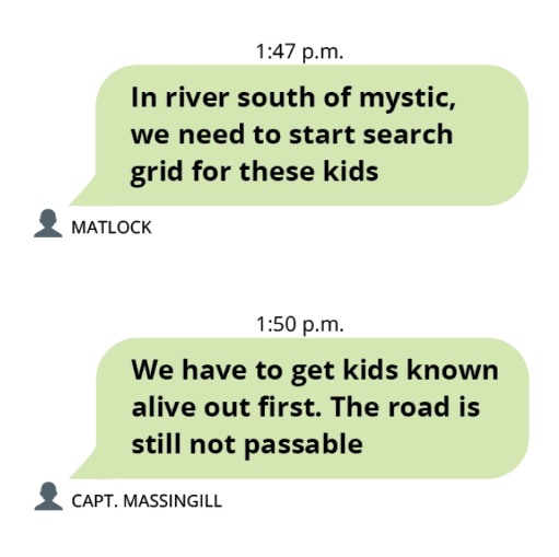 As the hours went on and the road to the camp remained impassable, the texts show the leaders in the text thread received sparse and sometimes contradictory information about whether anyone from the camp was missing — and how many were missing. As nightfall neared, the officials were still struggling to understand the scope of the disaster there.
