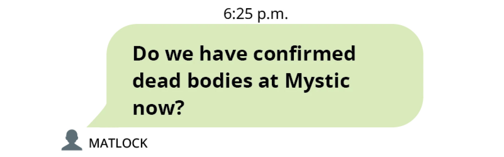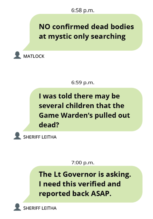 “NO confirmed dead bodies at mystic only searching,” Texas Ranger Chad Matlock texted the group just before 7 p.m.