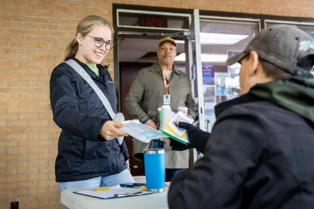 Hannah Smith, an assessor with Sunrise Homeless Navigation Center, hands a mask to a client.