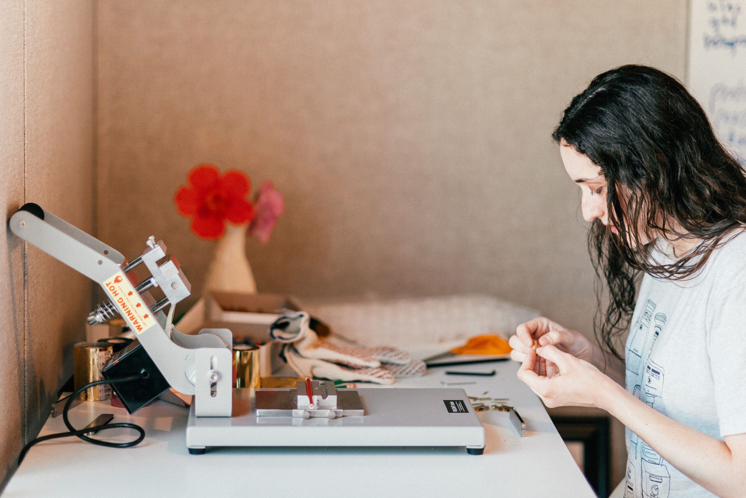“I have a foil stamping machine,” she said. “It heats up and you use different colored foils and you put them directly onto a pencil. So there’s like a pencil jig that you put the pencil into, it sits in there. You put the foil on top and you pull down a lever onto the pencil. So every single pencil that I stamp is hand-stamped one by one.”