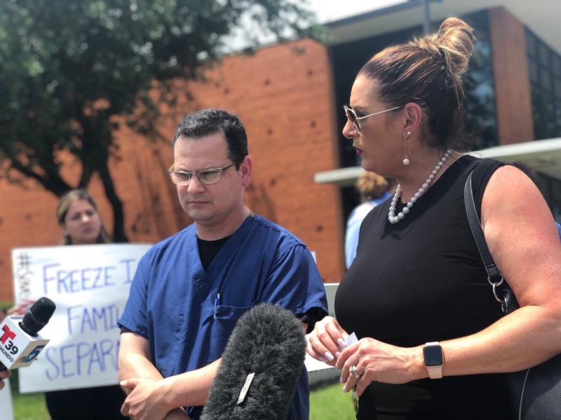 Rodrigo Ruiz and his attorney, Michelle Saenz-Rodriguez, stand outside the Dallas office of U.S. Immigration and Customs Enforcement