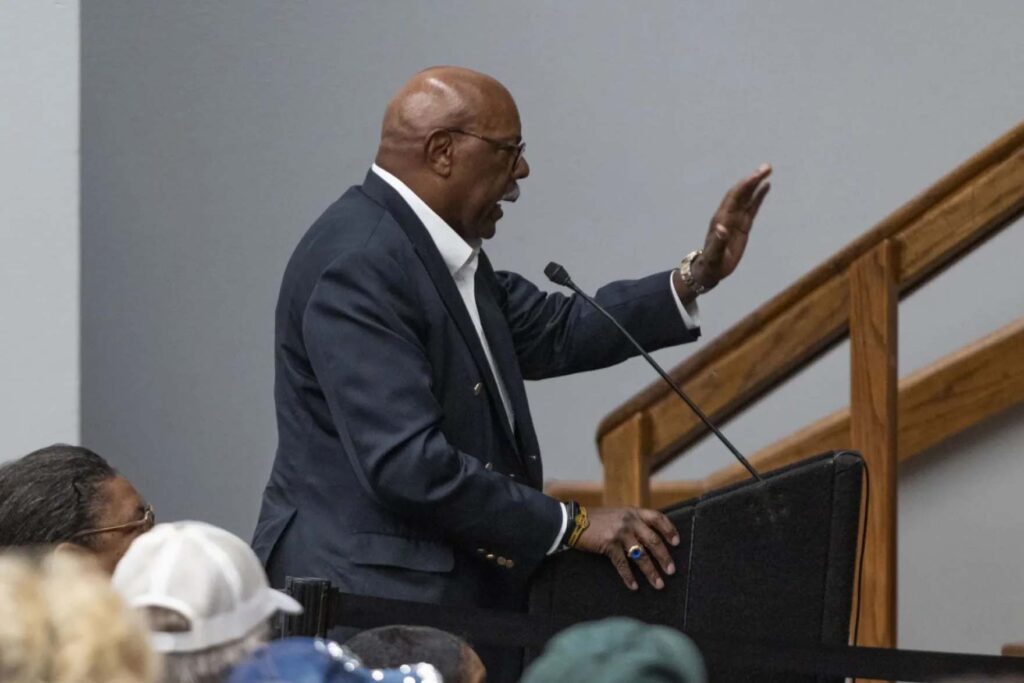 Chaplain Rich Stoglin, president of the Frederick Douglass Republicans of Tarrant County, speaks during a redistricting hearing July 28, 2025, at the UT Arlington University Center Rosebud Theater.