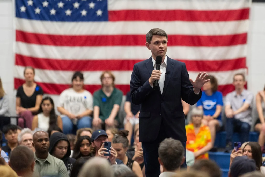 State Rep. James Talarico, D-Austin, speaks at a redistricting rally at Delco Activity Center in Austin on July 25, 2025.