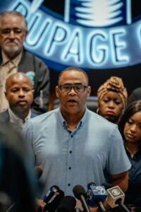 U.S. Rep. Marc Veasey, D-Fort Worth, speaks at a press conference with members of the Texas House Democratic Caucus at IBEW Local 701 in Warrenville, Ill., on Aug. 4, 2025.