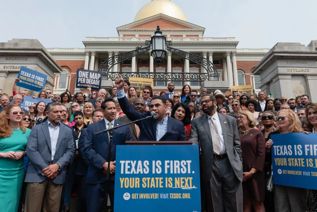 Surrounded by Democratic state representatives from all over the country, state Rep. Armando Walle, D-Houston, speaks at a press conference on the front steps of the Massachusetts State House in Boston on the 60th anniversary of the Voting Rights Act on Aug. 6, 2025.