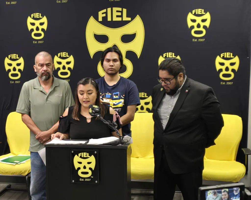 Aura Espinosa, legal department director at FIEL Houston, center, speaks at a press conference on Sept. 26, 2025. She was alongside, from left, Luis Antonio Medrano; his son Kevin Josefa; and Abraham Espinosa, community defense director at FIEL Houston. Courtesy of FIEL Houston